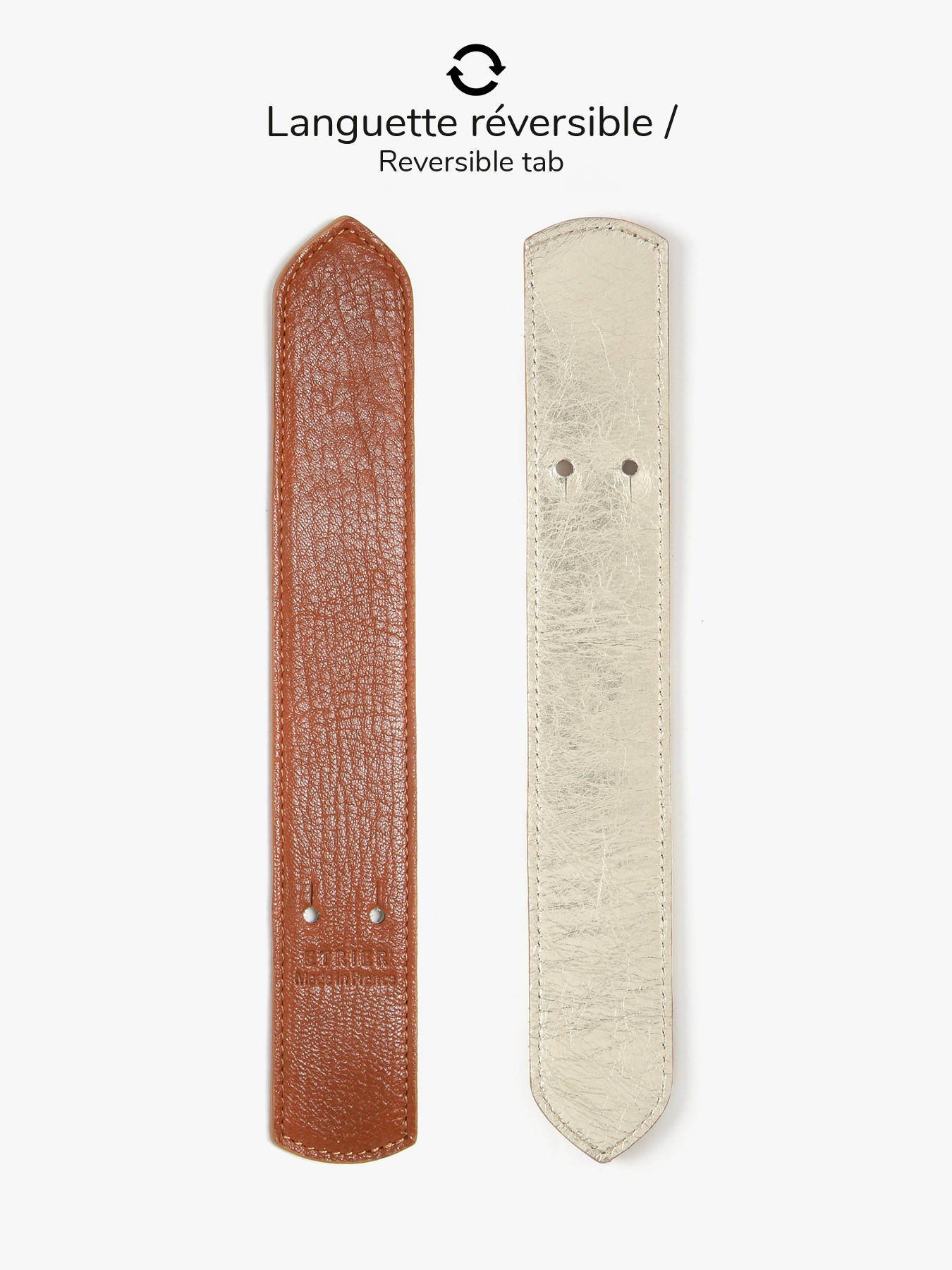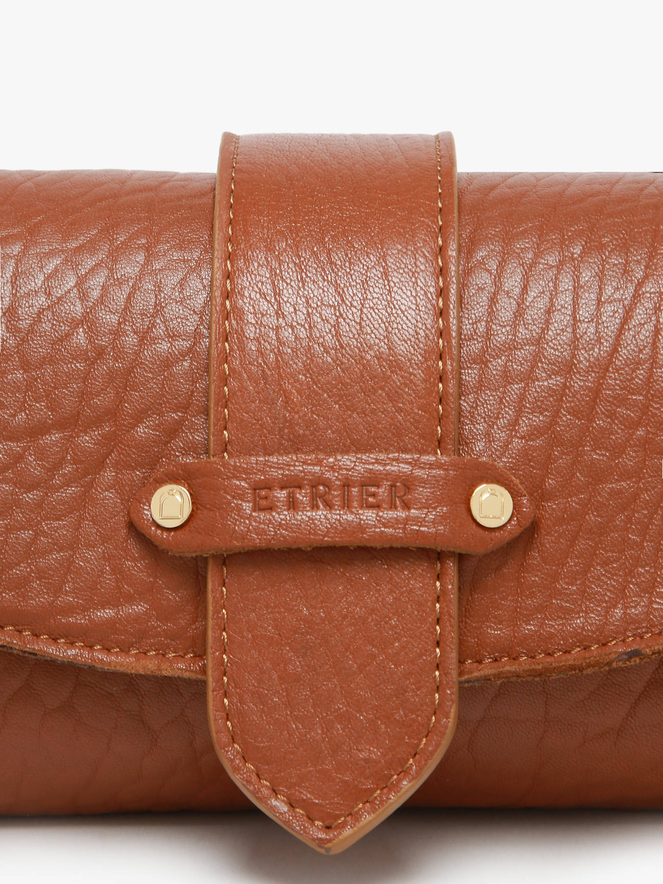 Le sac porté bandoulière AGNES par ETRIER est conçu en cuir de mouton crispé français. Ce modèle est présenté ici en taille S et se ferme par un rabat doté d'un bouton-pression aimanté. Il existe également en taille M pour celles et ceux qui souhaitent une contenance plus généreuse. Le sac est agrémenté d'une languette réversible, avec une face dorée et une face en cuir assortie au reste du sac. Elle se fixe facilement grâce à deux boutons de col et se glisse dans une poche arrière prévue à cet effet.