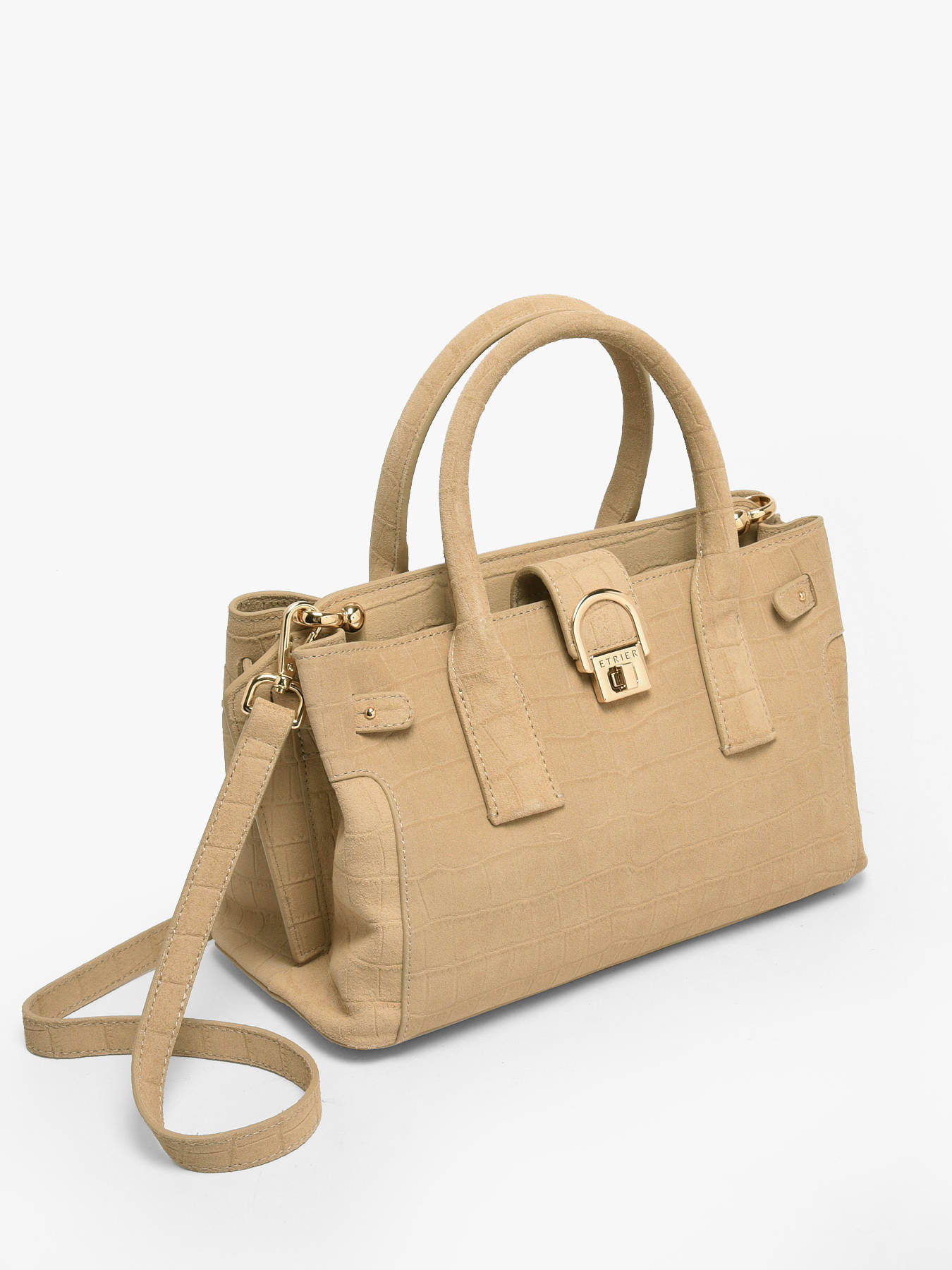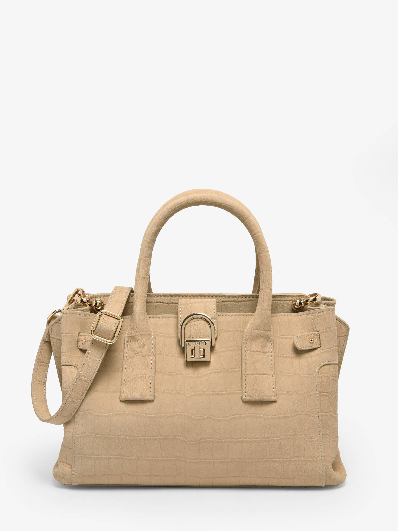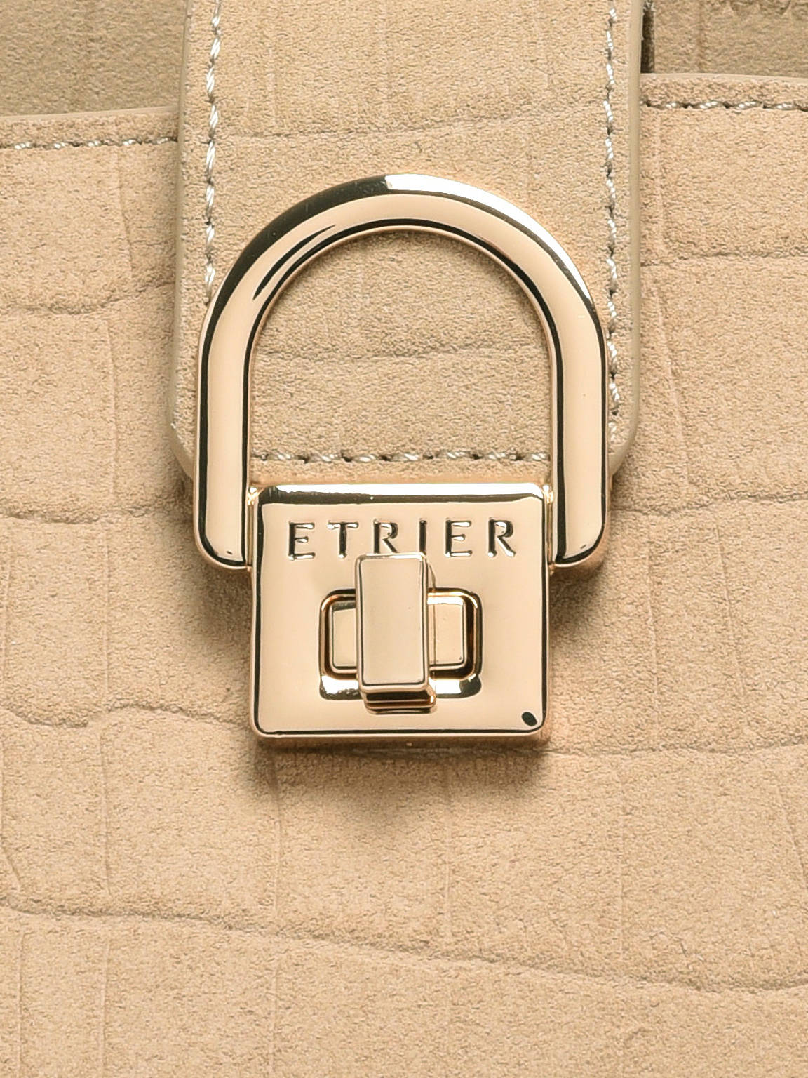 The EQUESTRE CROCO top-handle bag by Etrier, in a compact and refined format, is crafted from velvety cowhide leather with a crocodile-embossed finish. This bold blend of textures gives the piece a sophisticated look and a wild charm, emblematic of the Equestre line. It closes securely with a zip fastening, a flap, and a clasp, combining elegance and practicality. The handle height is 12 cm, and the bag also features a removable and adjustable shoulder strap, allowing for versatile carrying by hand or over the shoulder. Inside, two compartments, along with two slip pockets and one zip pocket, make it easy to organize your essentials. The gold-tone hardware adds a refined touch to this compact design. This bag is also available in size M for those who need extra space.
